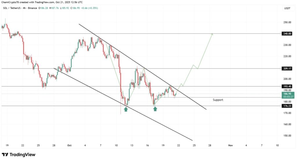 Seperti yang terlihat pada grafik, saat ini Solana sedang mencoba menembus channel menurun yang telah membatasi pemulihannya sejak awal Oktober. Jika berhasil ditutup di atas level $193,45, hal ini kemungkinan akan mendorong pergerakan menuju $209,17 dan membuka peluang untuk reli lebih lanjut hingga mencapai $240.