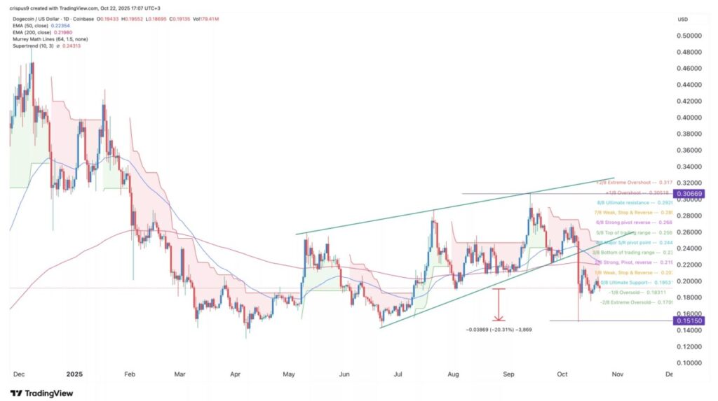 Lebih lanjut, harga DOGE telah menembus di bawah level support penting menurut alat Murrey Math Lines, serta di bawah indikator Supertrend dan Ichimoku Cloud — yang semuanya memperkuat sinyal bearish.