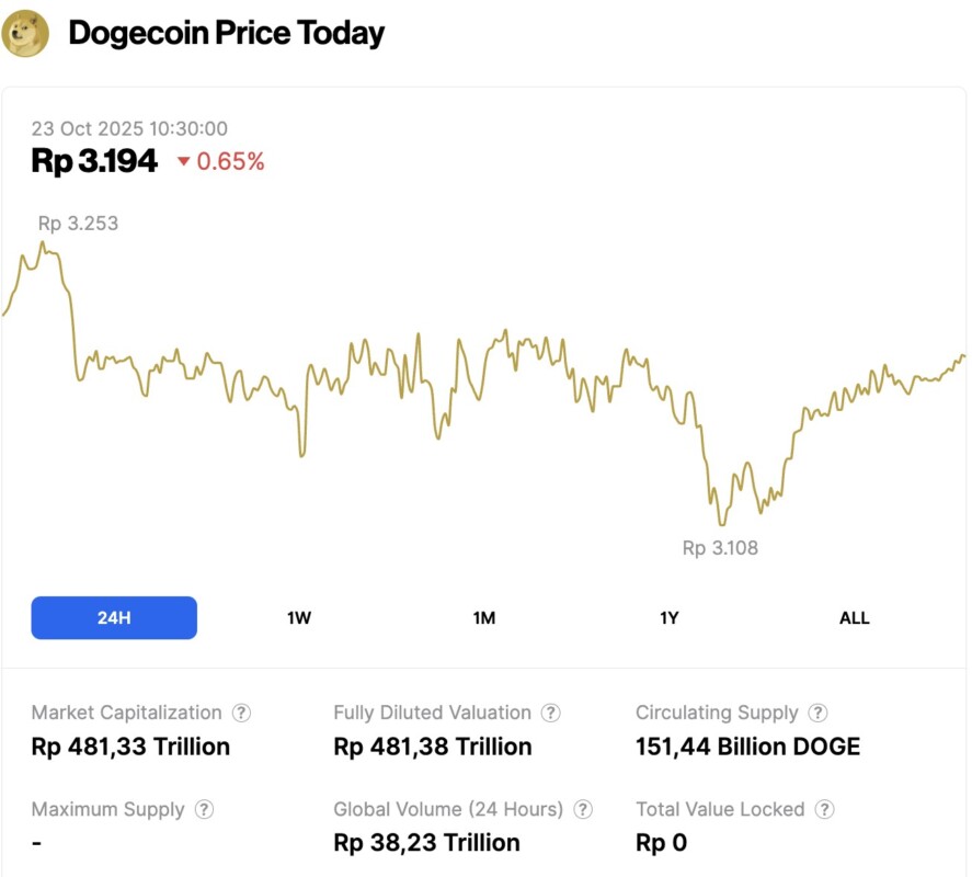Pada 23 Oktober 2025, harga Dogecoin tercatat mengalami penurunan 0,65% dalam waktu 24 jam, diperdagangkan pada harga $0.1915 atau setara dengan Rp3.194. Dalam periode 24 jam terakhir, harga DOGE bergerak dalam kisaran Rp3.253 hingga Rp3.108.