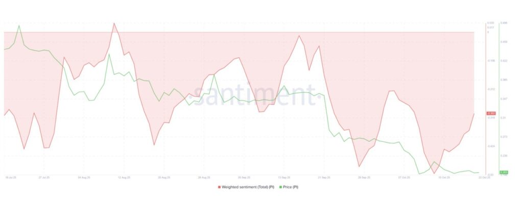 Indikator weighted sentiment, yang mengukur suasana hati kolektif investor, menunjukkan sinyal merah untuk Pi Coin. Nilainya telah turun jauh di bawah garis netral, menandakan pesimisme yang mendalam di antara pelaku pasar. Pandangan bearish ini mencerminkan semakin pudarnya kepercayaan terhadap prospek jangka pendek Pi Coin.