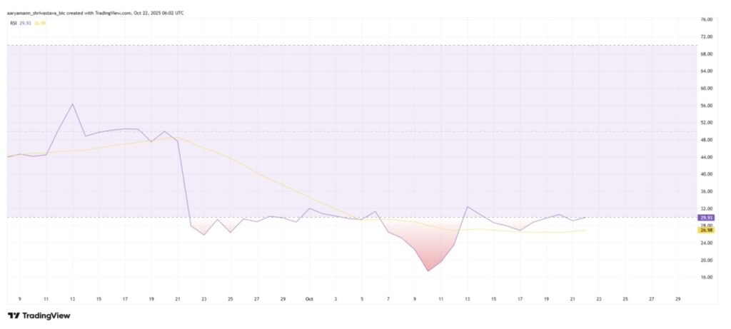 Dari perspektif teknikal yang lebih luas, momentum makro Pi Coin tetap berada dalam tren bearish yang kuat. Indikator Relative Strength Index (RSI) — yang umum digunakan untuk mengukur kekuatan tren — saat ini berada di zona bearish, bahkan beberapa kali menyentuh level oversold.