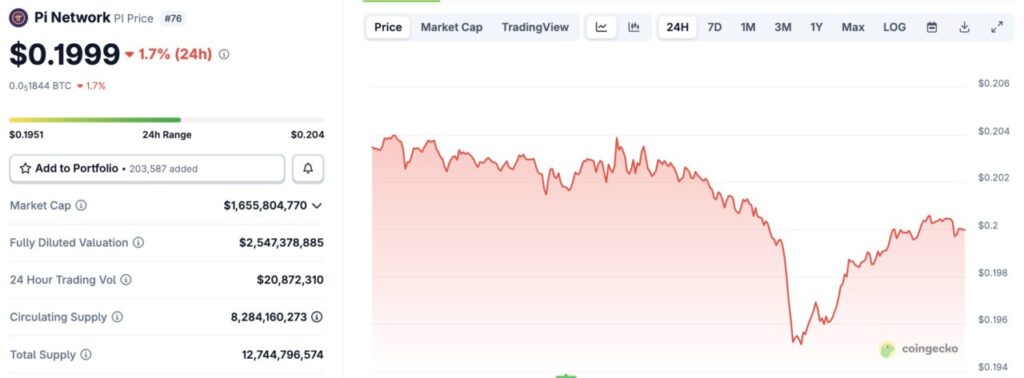 Dalam rentang waktu 24 jam, harga PI bergerak antara $0,1951 hingga $0,204, menunjukkan volatilitas yang relatif rendah. Kapitalisasi pasar Pi Network saat ini tercatat sebesar $1,65 juta, sementara volume perdagangan selama 24 jam terakhir tercatat sekitar $20,8 juta, menandakan adanya aktivitas jual beli yang cukup aktif di tengah penurunan harga.