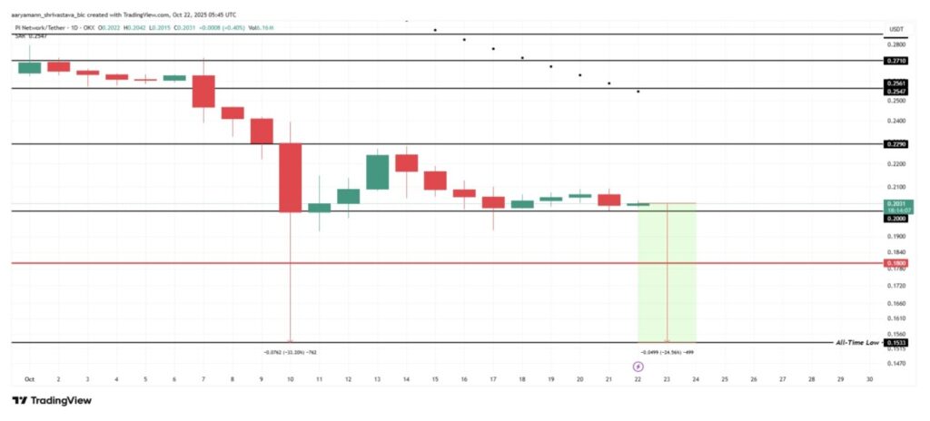 Per 22 Oktober, harga Pi Coin berada di level $0,203, dan telah berhasil bertahan di atas level support krusial $0,200 selama dua minggu terakhir. Meskipun tekanan jual terus meningkat, altcoin ini masih mampu bertahan, menunjukkan adanya resiliensi dari sisi pembeli.