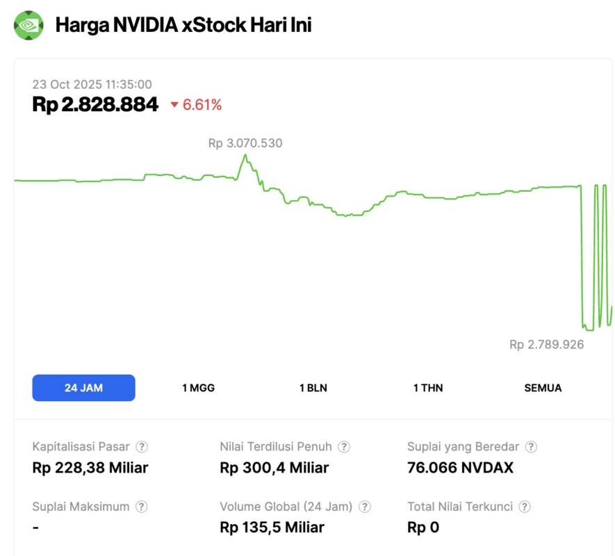 Dilansir dari Pintu Market, harga saham NVIDIA tertokenisasi dari xStock tengah mengalami penurunan 6,61%, dan di perdagangkan di sekitar Rp2.828.884 dalam waktu 24 jam. Berdasarkan chart yang ada, NVDAX sempat menyentuh titik terendahnya di Rp2.789.926 dan titik tertingginya di Rp3.070.530.