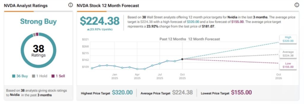Secara keseluruhan, sebanyak 38 analis memproyeksikan harga rata-rata saham Nvidia dalam 12 bulan ke depan berada di angka $224,38. Ini berarti ada potensi kenaikan sebesar 23,92% dari harga saat ini, menurut data dari platform riset pasar TipRanks.