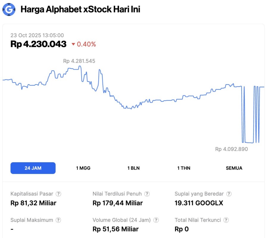 Meski mengumumkan kemajuannya, dilansir dari Pintu Market per 23 Oktober, harga saham Alphabet tertokenisasi dari xStock tengah mengalami koreksi tipis 0,40%, dan di perdagangkan di sekitar Rp4.230.043 dalam waktu 24 jam. Berdasarkan chart yang ada, GOOGLX sempat menyentuh terendahnya di Rp4.092.890 dan titik tertingginya di Rp4.281.545.