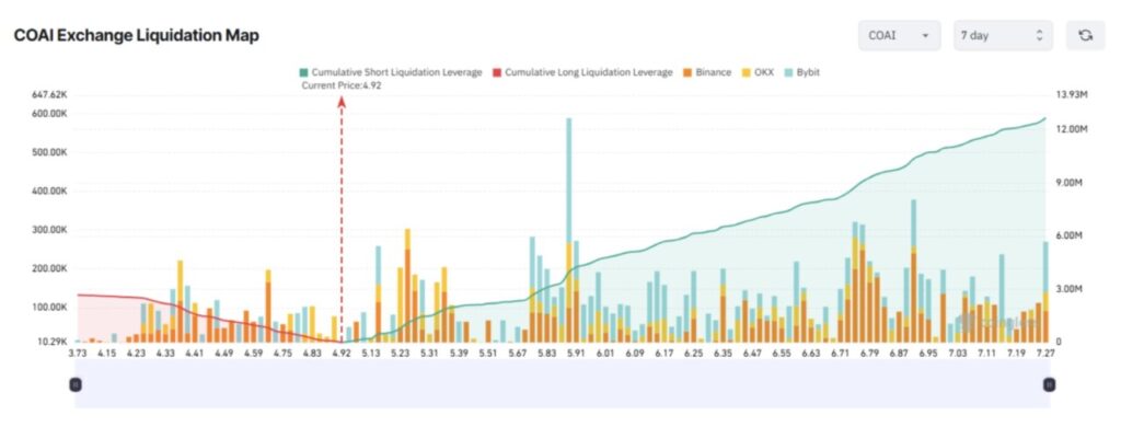 Data menunjukkan bahwa jika COAI berhasil pulih dan naik di atas $7 minggu ini, sekitar $11,5 juta posisi short bisa mengalami likuidasi. Sebaliknya, jika harga turun ke $3,73, sekitar $2,7 juta posisi long berisiko terkena likuidasi.