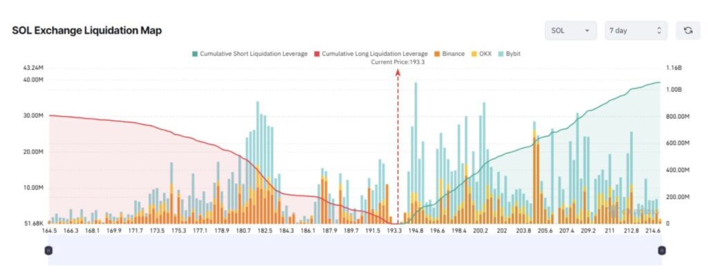 Peta likuidasi selama 7 hari terakhir juga mencerminkan sentimen bearish, dengan rentang level likuidasi short (yang ditampilkan pada grafik batang di sisi kanan) tersebar dari $193 hingga lebih dari $200.