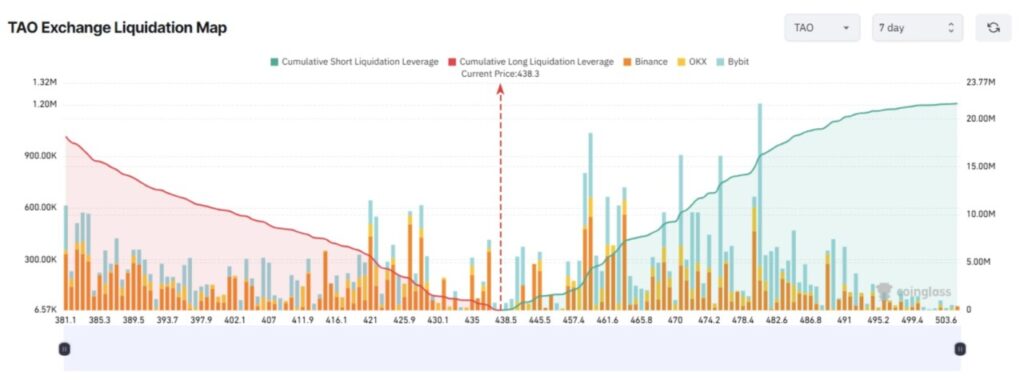 Perkembangan ini bisa menjadi kabar buruk bagi trader short. Jika harga TAO naik ke $500 minggu ini, posisi short dapat mengalami kerugian lebih dari $20 juta. Sebaliknya, jika TAO turun ke $381, posisi long akan menghadapi potensi likuidasi senilai $18 juta.