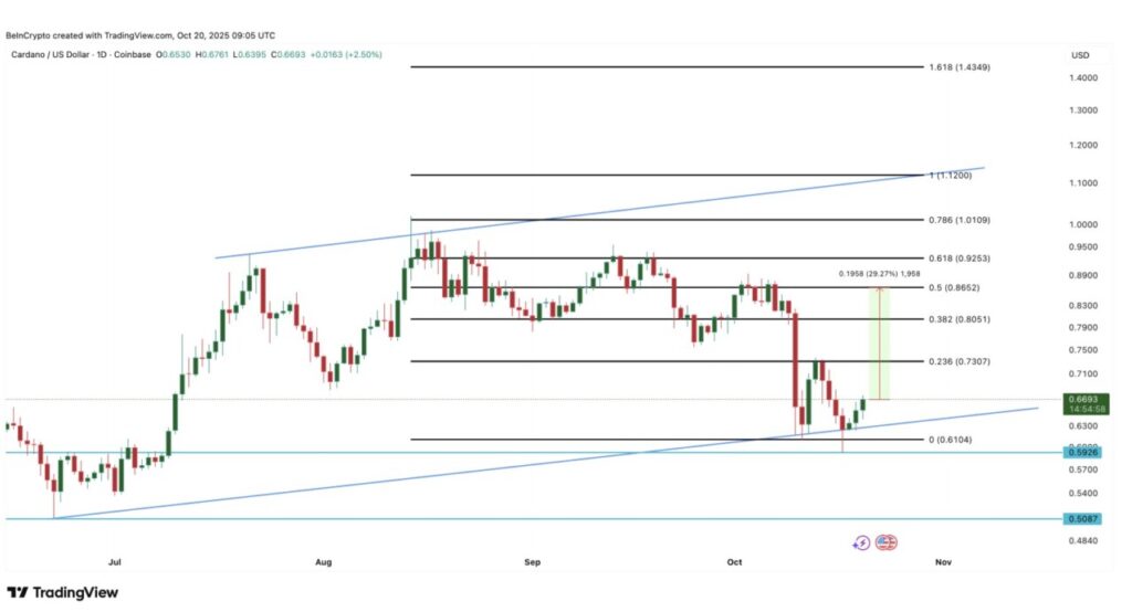 Dari posisi saat ini, ADA membutuhkan kenaikan sekitar 29% untuk mencapai $0,86. Jika persetujuan ETF benar-benar terjadi dan sentimen pasar tetap positif, target ini terlihat realistis. Namun, jika support di $0,61 gagal dipertahankan, harga bisa turun menuju $0,59 atau bahkan $0,50—yang dapat membatalkan pola bullish.