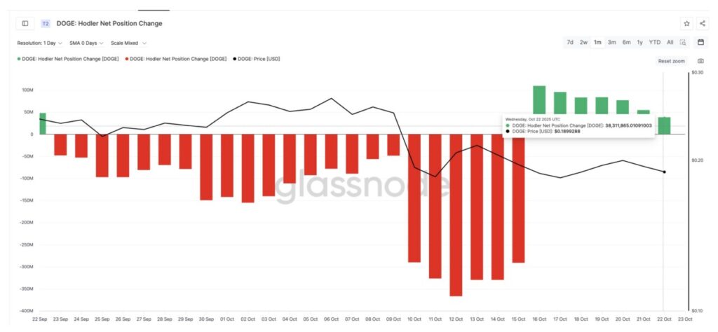Indikator Hodler Net Position Change, yang melacak apakah investor jangka panjang sedang menambah atau justru menjual aset mereka, kini menunjukkan sinyal bearish. Pada 16 Oktober, pemegang jangka panjang menambah sekitar 109,8 juta DOGE ke saldo mereka.