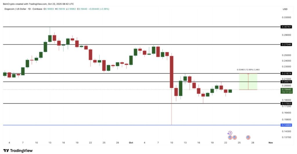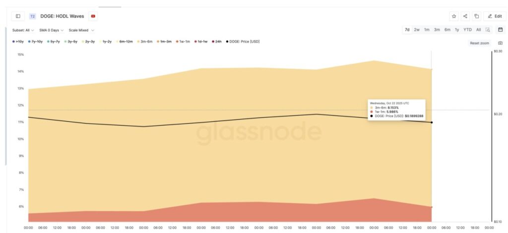 Data ini menunjukkan bahwa investor lama mulai mundur dan mengurangi eksposur mereka setelah berminggu-minggu tekanan harga. Sejak itu, harga Dogecoin bergerak mendatar, hanya turun sekitar 1,5% dalam tujuh hari terakhir, menandakan adanya dukungan beli yang mencegah penurunan lebih dalam.