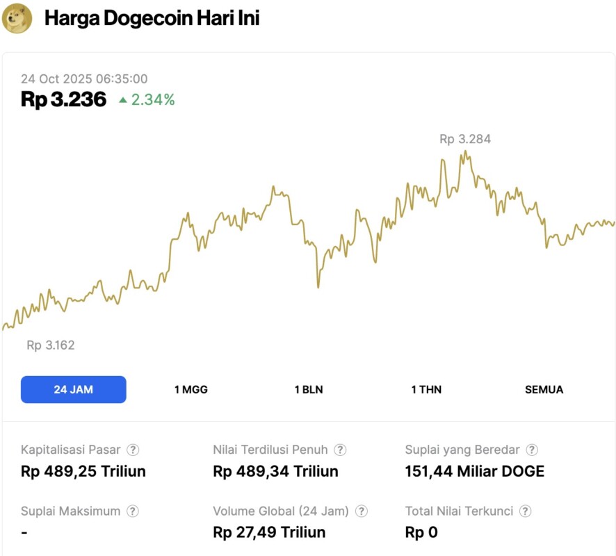Pada 24 Oktober 2025, harga Dogecoin tercatat mengalami kenaikan 2,34% dalam waktu 24 jam, diperdagangkan pada harga $0.1946 atau setara dengan Rp3.236. Dalam periode 24 jam terakhir, harga DOGE bergerak dalam kisaran Rp3.162 hingga Rp3.284.