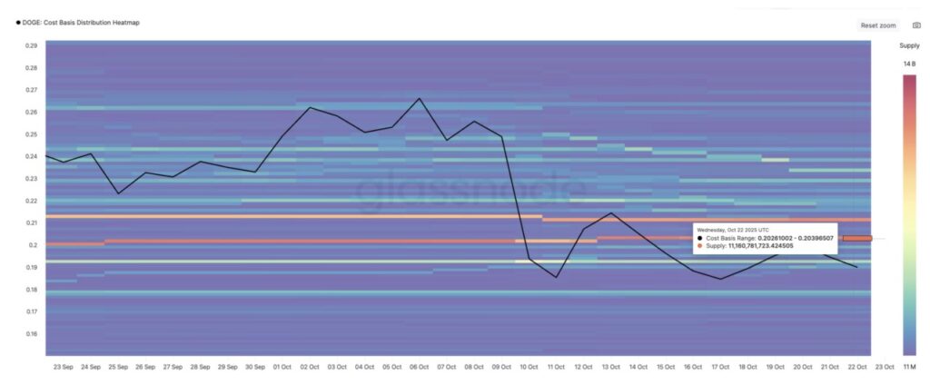 Bersama-sama, klaster-klaster ini membentuk salah satu hambatan jangka pendek paling kuat bagi Dogecoin. Setiap kali harga mendekati zona $0,20–$0,21, tekanan jual langsung muncul karena banyak pemegang mencoba menjual saat impas.
