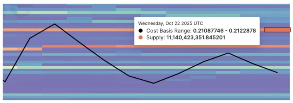 Terdapat dua klaster pasokan besar — di kisaran $0,202–$0,206 dan $0,210–$0,212 — yang masing-masing menyimpan sekitar 11,16 miliar DOGE dan 11,14 miliar DOGE. Ini adalah kelompok terbesar; masih ada klaster-klaster lebih kecil dengan jumlah DOGE yang lebih sedikit di sepanjang rentang tersebut.