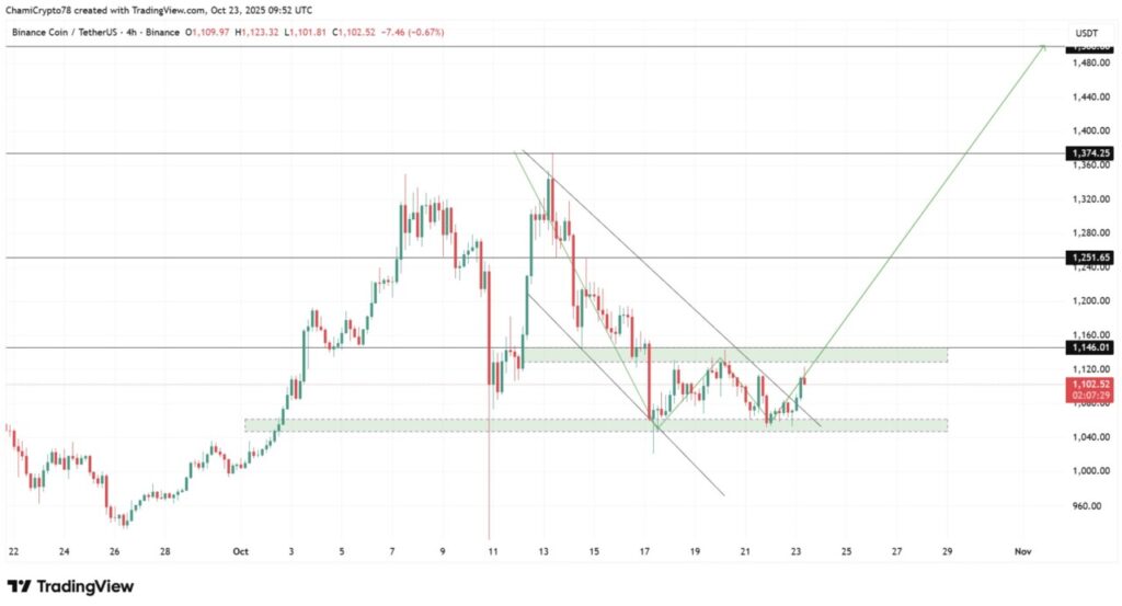 Pada grafik harian, harga BNB menembus pola channel menurun pada 23 Oktober, mengonfirmasi pola pantulan ganda (double bottom) dari zona permintaan. Struktur ini menyoroti meningkatnya kepercayaan pembeli setelah berminggu-minggu pertahanan kuat di kisaran $1.080ā$1.100.
