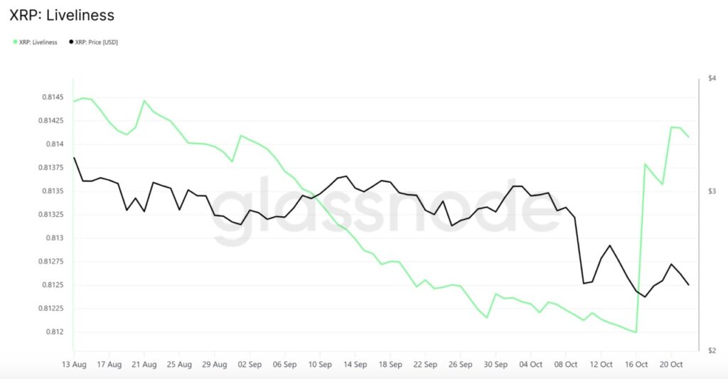 Dari sisi makro, metrik Liveliness XRP—yang mengukur aktivitas pemegang jangka panjang (long-term holders/LTH)—mengalami peningkatan yang signifikan. Lonjakan ini mencerminkan mulai bergeraknya koin-koin yang sebelumnya tidak aktif, yang mengisyaratkan bahwa investor jangka panjang mulai menjual kepemilikannya.