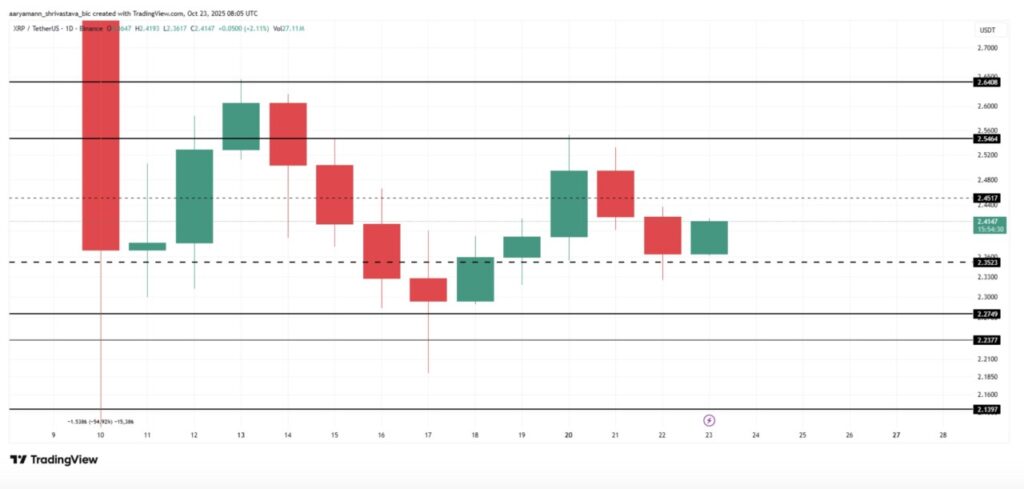 Per 23 Oktober, XRP diperdagangkan di harga $2,41, sedikit di atas level support $2,35 namun masih tertahan di bawah resistance $2,54. Volatilitas pasar mulai menyempit, namun indikator momentum tetap menunjukkan kecenderungan bearish seiring meningkatnya tekanan jual di berbagai bursa.
