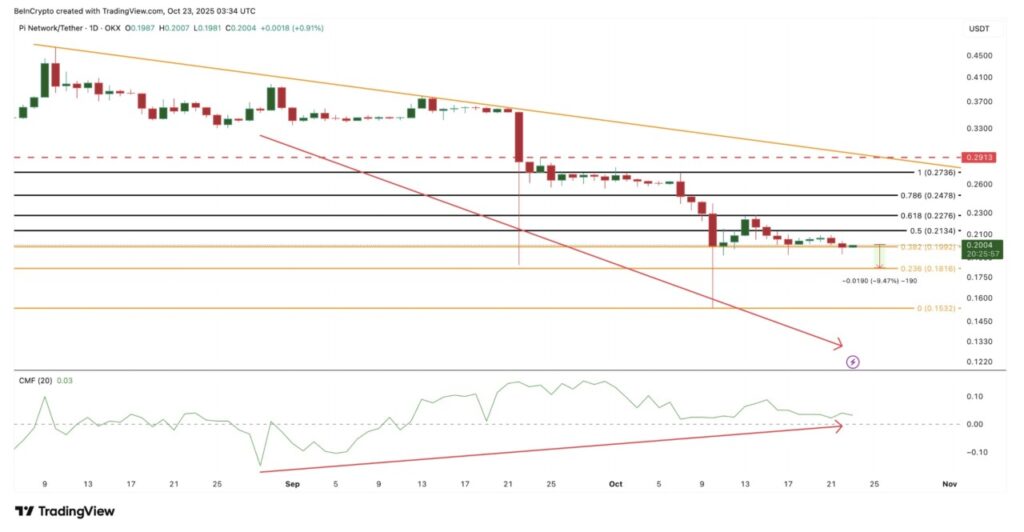 Jika pola bullish divergence ini benar-benar terwujud, target kenaikan pertama untuk PI berada di sekitar $0,21 — sedikit di atas level Fibonacci 0.382 saat ini di $0,19. Penutupan harian yang bersih di atas $0,29 akan mengonfirmasi breakout dan membatalkan struktur bearish, yang bisa memulihkan kepercayaan dalam jangka pendek.