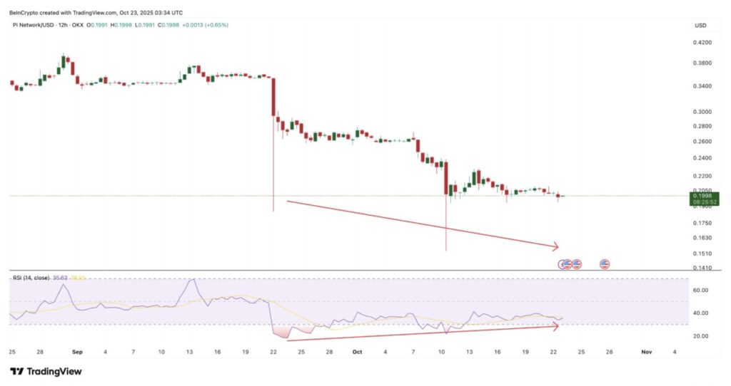 Indikator Relative Strength Index (RSI) — yang mengukur kekuatan momentum harga — pada grafik harian menunjukkan potensi pembalikan arah. Antara 23 September hingga 22 Oktober, harga Pi terus mencatat level terendah yang baru, tetapi RSI justru mencetak level terendah yang lebih tinggi — membentuk pola bullish divergence.