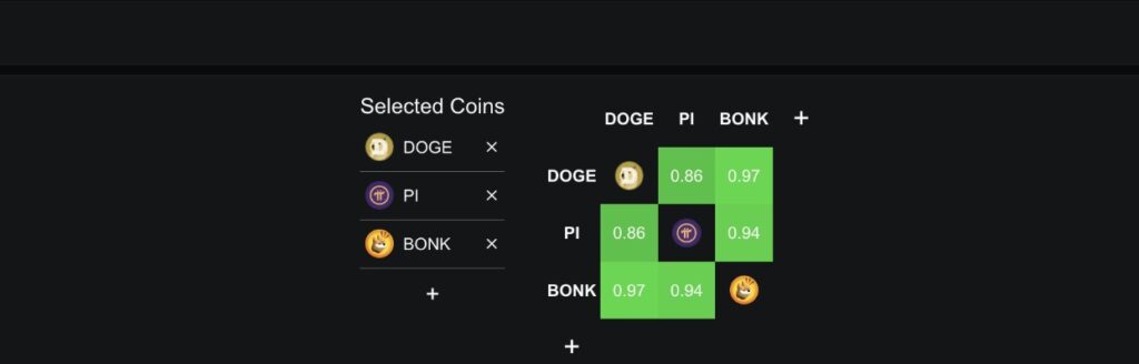 Dalam sebulan terakhir, pergerakan harga Pi Coin mulai menyerupai pola pergerakan Dogecoin dan Bonk . Koefisien korelasi Pi Coin kini berada di angka 0,87 dengan DOGE dan 0,94 dengan BONK — artinya, harga Pi sering bergerak searah dengan kedua token meme tersebut.