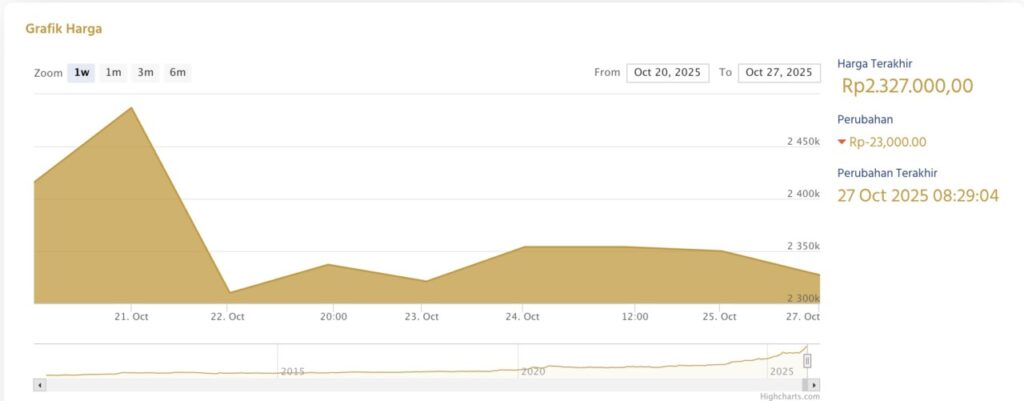 Menjelang akhir pekan, pada 27 Oktober 2025, harga emas tercatat di level Rp2.327.000 per gram, atau turun Rp23.000 dibandingkan hari sebelumnya. Penurunan ini menandakan adanya tekanan jual ringan meski harga masih bertahan di atas area psikologis Rp2.300.000.