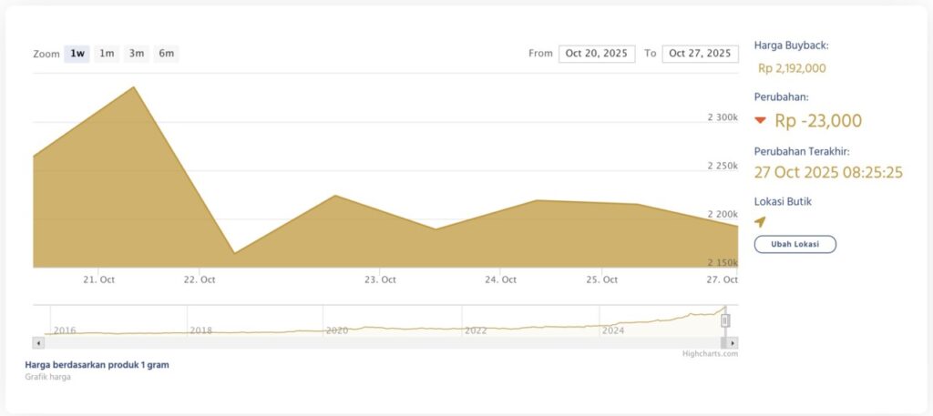 Menjelang akhir periode, tepat pada 27 Oktober 2025 pukul 08:25 WIB, harga buyback emas tercatat di Rp2.192.000 per gram, atau turun sebesar Rp23.000 dibandingkan hari sebelumnya. Secara umum, grafik ini menunjukkan tren koreksi ringan setelah lonjakan harga di awal pekan.
