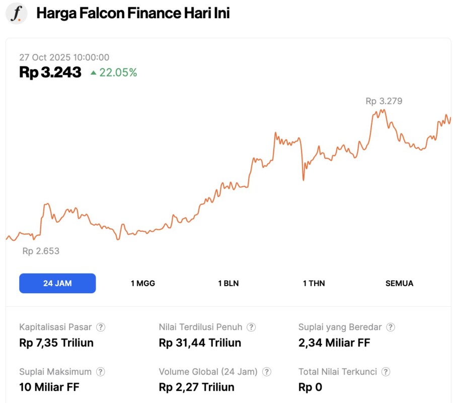Token Falcon Finance (FF) mencatatkan kenaikan harga harian yang solid sebesar 22,05%, naik dari level Rp2.653 menjadi Rp3.243 per token. Harga sempat mencapai puncak di Rp3.279, menandakan momentum bullish yang kuat di tengah meningkatnya aktivitas pasar.