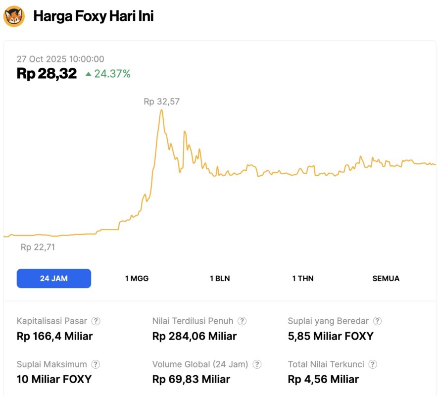 Token Foxy mencatatkan lonjakan harga signifikan sebesar 24,37% dalam kurun waktu 24 jam terakhir. Harga FOXY naik dari Rp22,71 dan sempat menyentuh puncaknya di Rp32,57, sebelum stabil di Rp28,32 per token.
