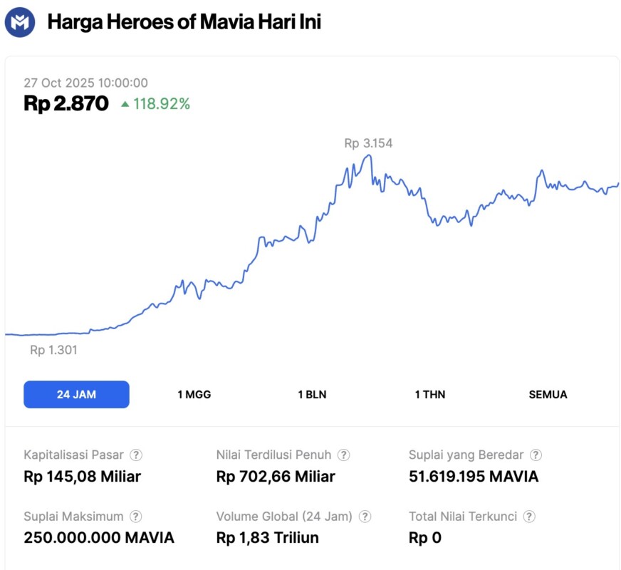 Harga token Heroes of Mavia mencatat lonjakan tajam sebesar 118,92% dalam 24 jam terakhir, naik dari sekitar Rp1.301 ke Rp2.870 per token. Bahkan, harga sempat menyentuh titik tertinggi harian di Rp3.154, sebelum terkoreksi ringan.
