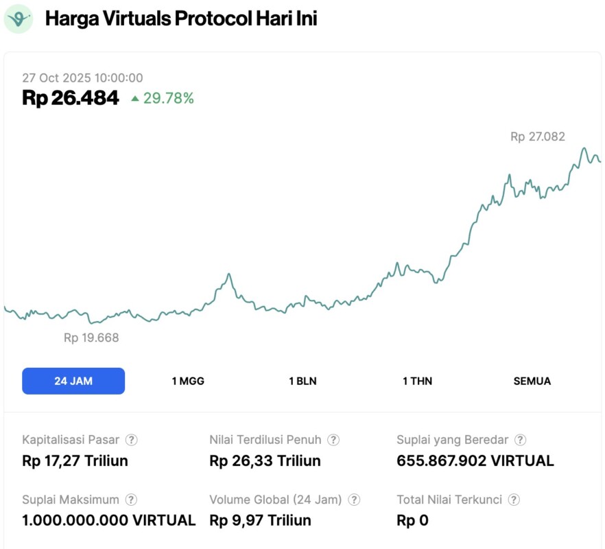 Di posisi kedua dalam kategori altcoin yang menggairahkan hari ini adalah VIRTUAL. Harga token Virtuals Protocol (VIRTUAL) melonjak signifikan sebesar 29,78% dalam 24 jam terakhir, mencapai Rp26.484. Lonjakan harga ini menandai kenaikan dari level terendah harian di Rp19.668, dengan titik tertinggi menyentuh Rp27.082.