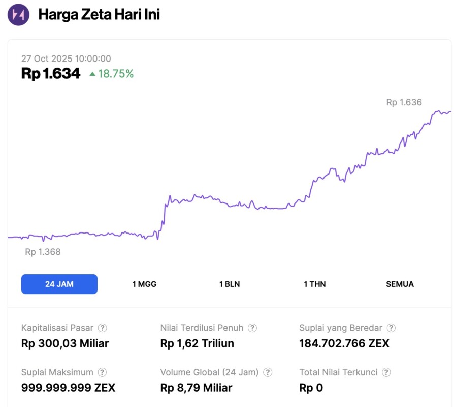 Aset kripto Zeta mencatatkan kenaikan harian sebesar 18,75%, naik dari harga Rp1.368 menjadi Rp1.634 per token. Kenaikan ini terjadi dengan tren yang stabil sepanjang hari, bahkan sempat menyentuh harga tertinggi di Rp1.636.