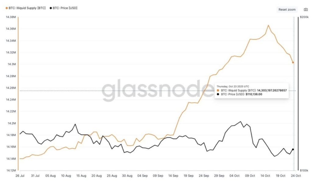 Pasokan Bitcoin yang tidak likuid kembali mengalami penurunan, dengan sekitar 62.000 BTC berpindah dari dompet tidak aktif sejak pertengahan Oktober. Pergerakan ini menunjukkan bahwa semakin banyak koin yang kembali beredar di pasar, yang berpotensi meningkatkan tekanan jual.
