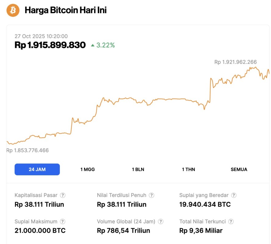Pada 27 Oktober 2025, harga Bitcoin tercatat berada di level $114,987 atau setara dengan Rp1.915.899.830, mengalami kenaikan 3,22% dalam 24 jam terakhir. Sepanjang periode ini, BTC menyentuh level terendahnya di Rp1.853.776.466 dan harga tertingginya di Rp1.921.962.266.