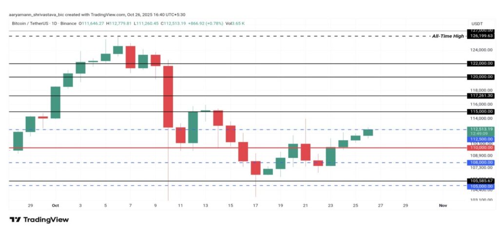 Pada 27 Oktober, harga Bitcoin sempat berada di angka $112.513, sedikit di atas level penting $112.500. Menjadikan level ini sebagai support yang kuat sangat krusial untuk menjaga kelanjutan pemulihan.