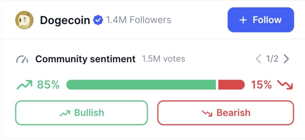 Data dari CoinMarketCap mengungkapkan bahwa sentimen komunitas terhadap Dogecoin sangat positif, dengan tingkat optimisme yang tinggi mencapai 85%. Artinya, mayoritas besar pengguna meyakini tren harga DOGE akan terus naik di masa depan.