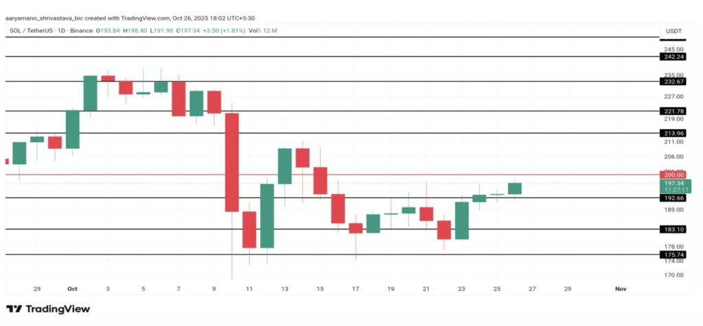 Per 26 Oktober, Solana diperdagangkan di harga $197, berada tepat di bawah level resistance $200. Level harga ini berulang kali menjadi batas atas yang menghambat pemulihan yang berkelanjutan. Untuk menandakan kekuatan tren naik, SOL harus mampu menembus dan menjadikan $200 sebagai support yang solid.