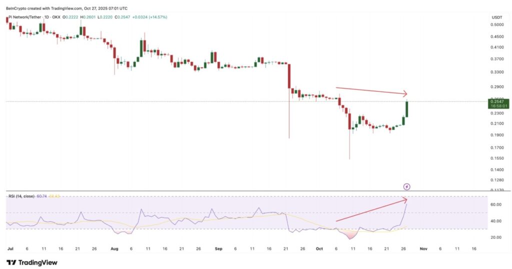 Antara 6 Oktober hingga 27 Oktober, harga PI membentuk lower high (puncak yang lebih rendah), sementara indikator Relative Strength Index (RSI)—yang mengukur kekuatan beli dan jual—justru mencetak higher high (puncak yang lebih tinggi).