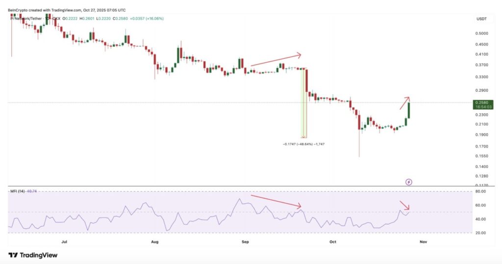 Indikator teknikal lain, yaitu Money Flow Index (MFI) yang memantau aliran modal masuk ke pasar, juga menunjukkan sinyal serupa. Sejak 24 Oktober, harga PI mencetak puncak yang lebih tinggi, namun MFI justru menurun—menunjukkan bahwa jumlah dana baru yang masuk ke pasar semakin berkurang, meski harga terus naik.