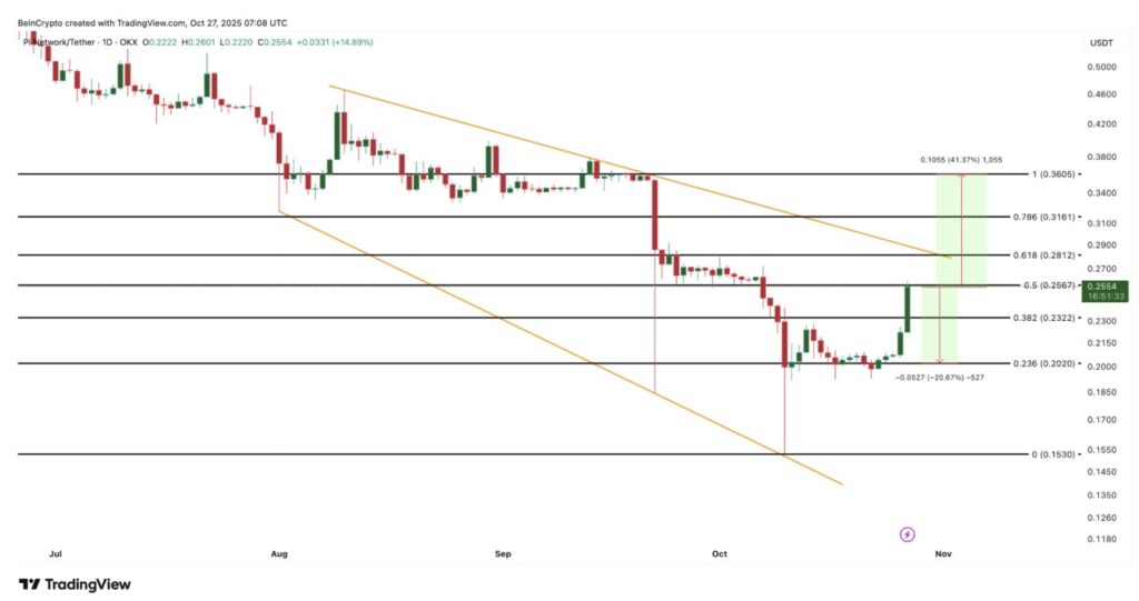 Jika candle harian berhasil ditutup di atas level tersebut, maka itu akan mengonfirmasi breakout dari pola wedge, dan membuka peluang kenaikan lebih lanjut menuju $0,36—sekitar 41% lebih tinggi dari level saat ini.