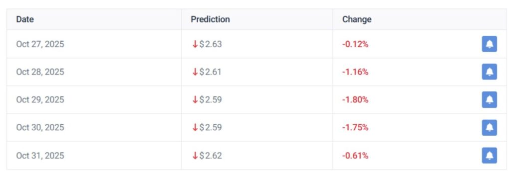 Berdasarkan prediksi dari CoinCodex, XRP diperkirakan akan menghadapi koreksi dalam lima hari ke depan. Harga diperkirakan akan bergerak dalam kisaran $2,59–$2,63 selama minggu ini, dengan potensi penurunan sekitar 1%. Ini mengisyaratkan fase pendinginan setelah reli kuat sebelumnya.