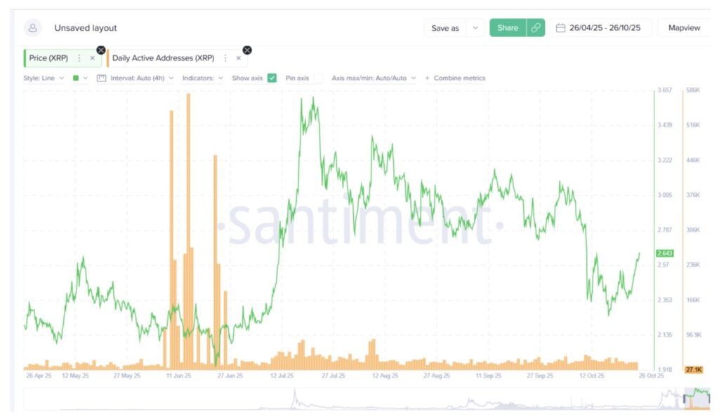 Jika melihat pola sebelumnya, lonjakan besar dalam harga XRP seringkali terjadi bersamaan dengan peningkatan tajam pada jumlah alamat aktif. Ini menunjukkan pola yang mengarah pada tren bullish baru seiring dimulainya kuartal keempat.