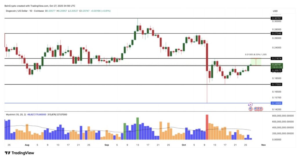Level kunci yang perlu diperhatikan adalah $0,21. Jika DOGE berhasil menembus level ini dengan jelas, potensi kenaikan sebesar 6% menuju $0,27 bisa terjadi — terutama jika selera risiko pasar meningkat akibat kemungkinan pemangkasan suku bunga oleh The Fed.