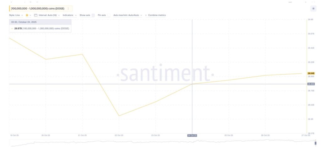 Menambah daya tarik, para whale Dogecoin tampak mulai melakukan akumulasi diam-diam. Dalam 48 jam terakhir, pemegang dengan saldo antara 100 juta hingga 1 miliar DOGE meningkatkan kepemilikan mereka dari 28,87 miliar menjadi 29,04 miliar DOGE.