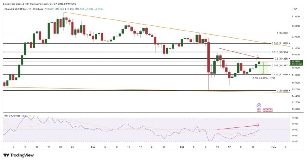 Harga membentuk lower high (puncak yang lebih rendah), tetapi Relative Strength Index (RSI), yang mengukur tekanan beli dan jual, justru mencatat higher high (puncak yang lebih tinggi). Ini sering kali menjadi tanda bahwa tren turun yang lebih besar bisa saja berlanjut. Selama sebulan terakhir, harga LINK turun 10,2%, meskipun naik 6,8% dalam sepekan terakhir.