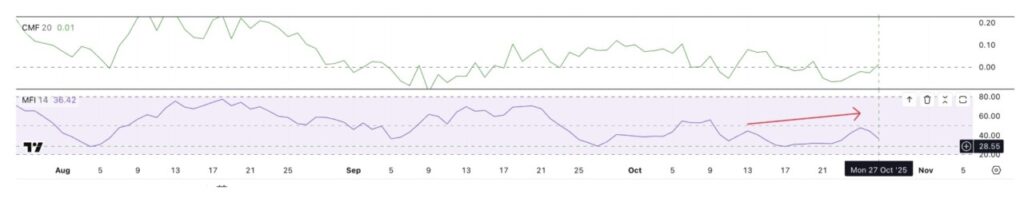 Namun demikian, tidak semua sinyal bersifat bearish. Money Flow Index (MFI), yang mengukur arus masuk dan keluar dana dari aset, menunjukkan puncak yang lebih tinggi sejak pertengahan Oktober — tanda bahwa aksi beli saat harga turun masih berlanjut.