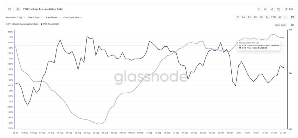 Rasio akumulasi pemegang, yang mengukur berapa banyak dompet yang menambah dibandingkan mengurangi kepemilikan ETH-nya, turun dari 31,278 menjadi 30,964 — penurunan sekitar 1% dari puncaknya dalam tiga bulan terakhir.