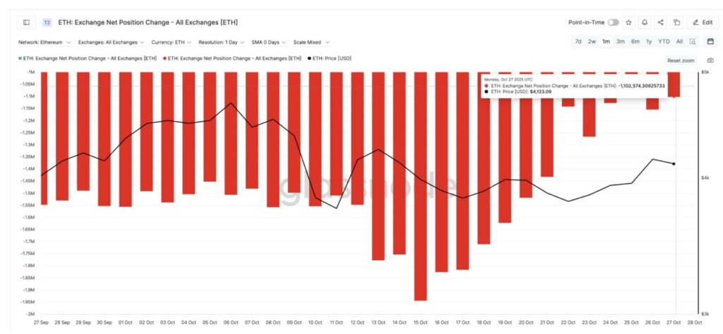 Pada saat yang sama, arus dana ke dan dari bursa juga mengonfirmasi perubahan sentimen ini. Perubahan posisi bersih di bursa, yang menunjukkan seberapa banyak ETH yang keluar dari bursa, menjadi kurang negatif. Pada 15 Oktober, aliran keluar tercatat sekitar 1,94 juta ETH, namun pada 27 Oktober menyusut menjadi 1,10 juta ETH — penurunan sebesar 43%.