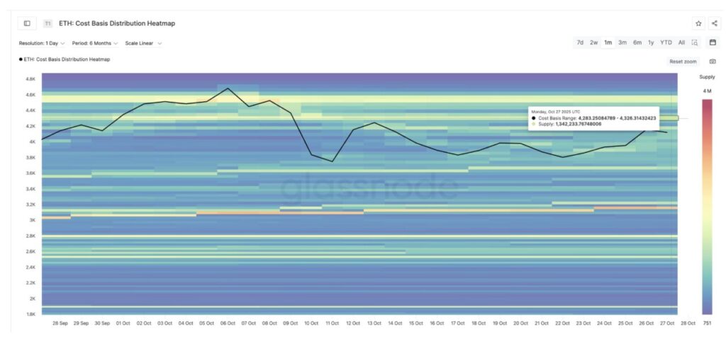 Peta panas cost-basis, yang menampilkan di mana banyak ETH terakhir kali dibeli dalam jumlah besar, menunjukkan klaster pasokan terkuat berada di kisaran $4.283 hingga $4.326 — dengan total sekitar 1,34 juta ETH.