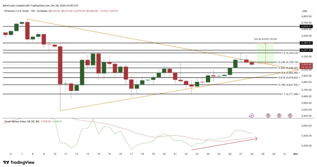 Ethereum masih bergerak dalam pola segitiga simetris yang terbentuk sejak 7 Oktober. Penolakan terbaru di garis tren atas pada 27 Oktober menunjukkan adanya resistensi kuat, namun tidak membatalkan struktur pola secara keseluruhan.